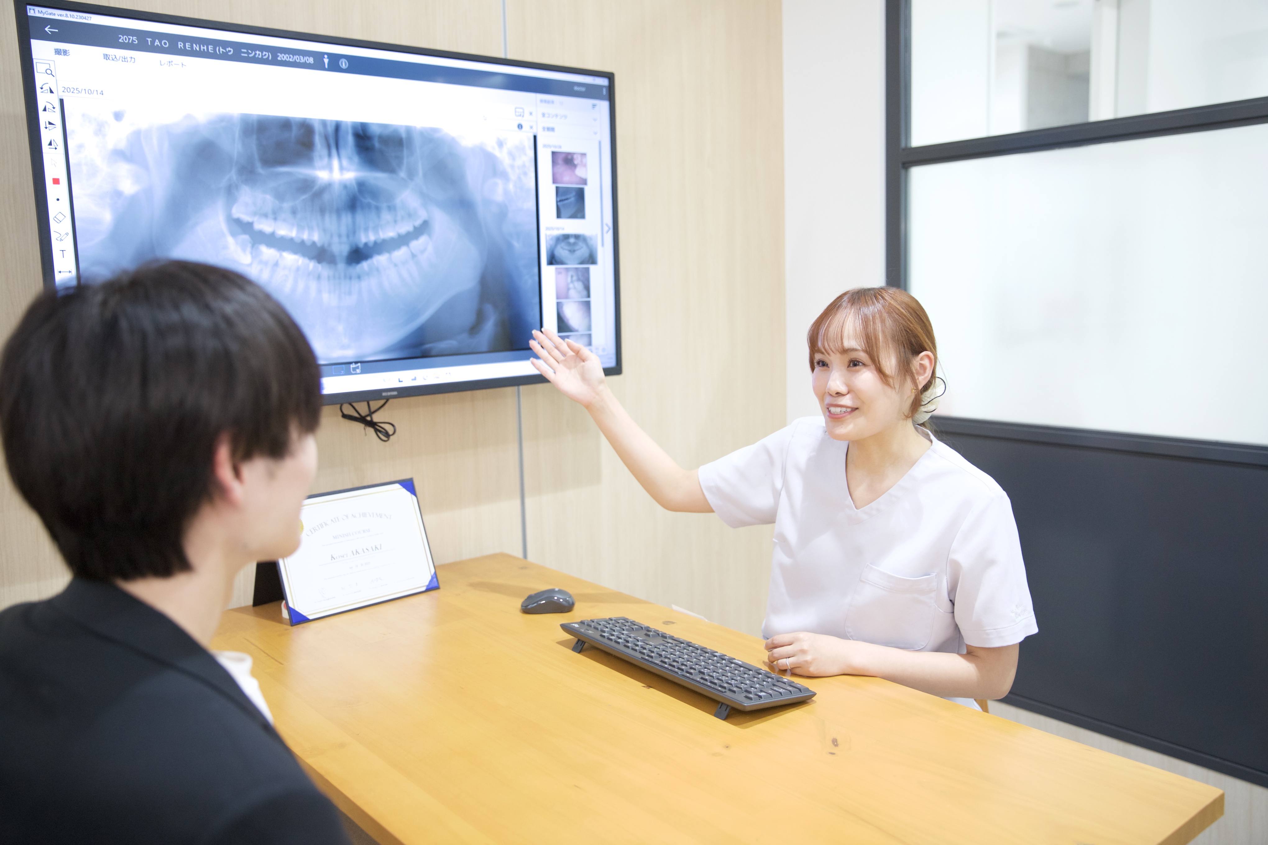 治療を始める前に、患者様のお悩みやご希望を丁寧にお伺いします。口腔内カメラやCT画像を用いて、現在のお口の状態を分かりやすくご説明します。治療内容、期間、費用について詳しくお伝えし、患者様が納得されてから治療を開始します。疑問や不安があれば、遠慮なくお聞きください。
