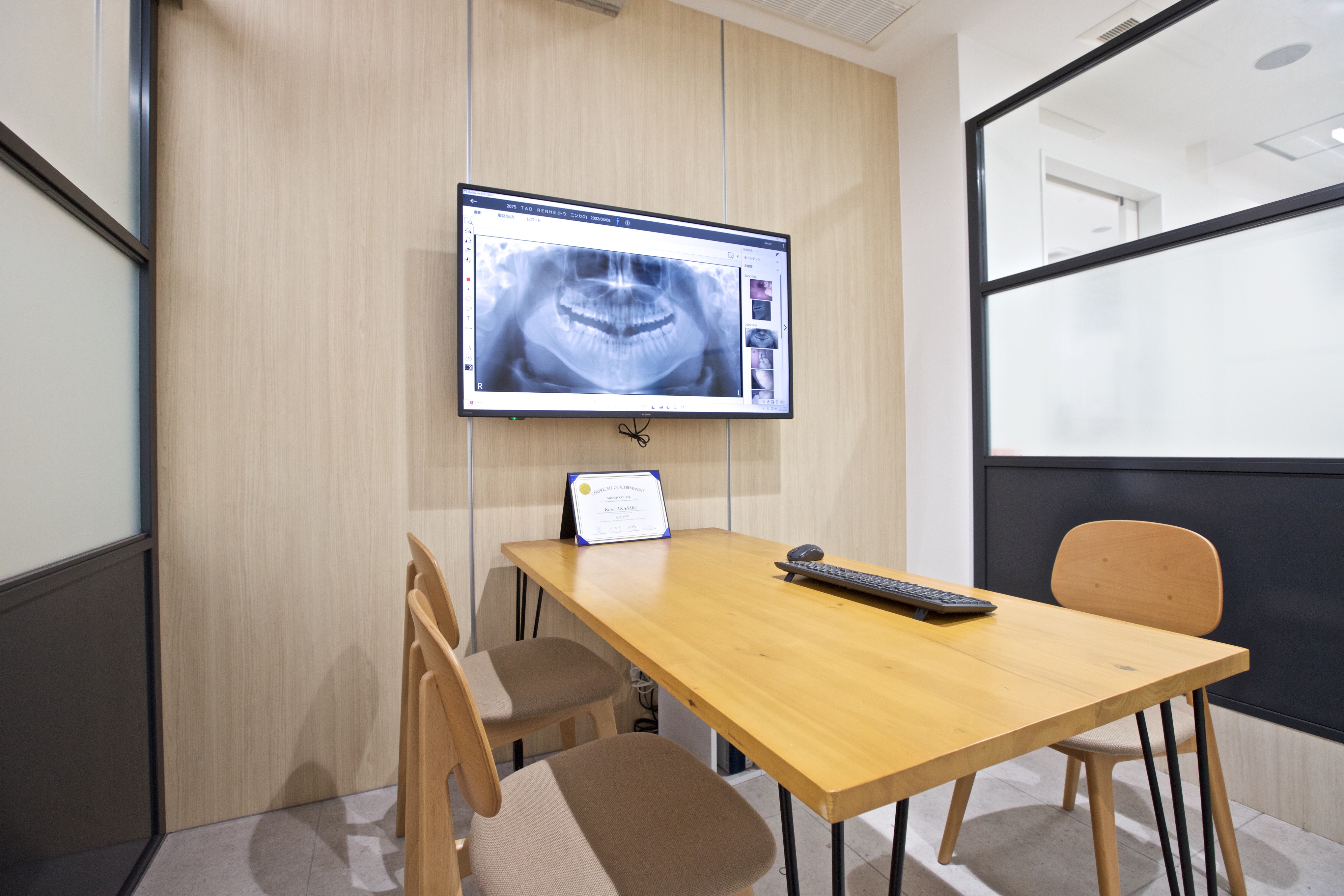 治療前のカウンセリングは、個室のカウンセリングルームで行います。周囲を気にすることなく、お悩みやご希望をじっくりお聞かせください。治療内容、費用、期間について、詳しくご説明します。インプラントや矯正治療など、高度な治療をご検討の方も、安心してご相談いただけます。中国語を話せるスタッフも在籍しておりますので、中国語でのご相談も承っております。